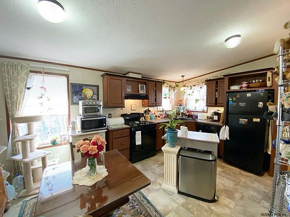 This 6 year young manufactured home has a lot to offer for less than renting! Cozy living room with eat-in kitchen, 2 bedrooms, 1 bath, plus laundry room. Backs up to a wooded area for privacy. Close to all amenities, shopping and easy access to I-87. Pets allowed. Requires approval through Hoffman Homes for any buyer - lot rental includes snow removal, trash and water.