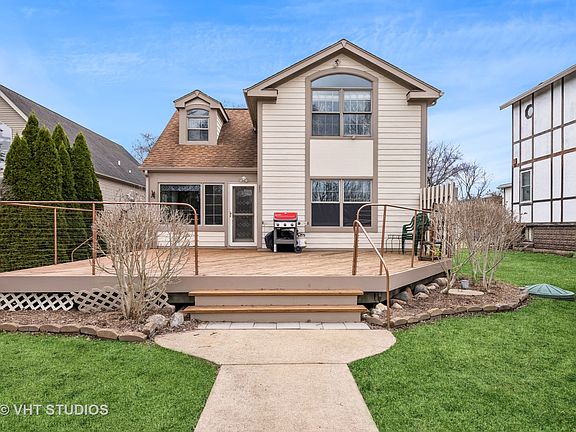 Multiple offers received. Calling for Highest and best by 10 am Monday morning. No more showing after 4pm today, Sunday. Seller will be on the couch, recovering from her fall! Ring the doorbell , her grandson will open the door for you. Super cool house on the Fox River! 2 piers to fish from, boat house for storage,fishing gear, or garden shed or a "She" shed! Located across from a park, so NO neighbors across the river! Beautiful Mahogany double doors welcome you into the Vaulted ceiling foyer with hardwood flooring, open floor plan, huge kitchen with all appliances staying. Living room overlooks the Fox River with magnificent views. 2 main floor beds, 1 full bath. 2nd floor is huge, and I mean Huge Primary, with Huge walk in closet and the smallest bathroom, really! It was all there when owner moved in! Large crawl space for a basement, about 4 ft deep, concrete flooring for lots of storage plus a regular crawl space. On the back deck is the electric button to "lift" the door to the crawl space for easy access, and a brand new sump has been just installed. Lovely Living room to watch the river go by! Or walk out on to the redone large deck, and enjoy the birds, flowers, nature. It's the best, and if you fish, great fishing here! Need room for cars, 4+ car tandem garage for ya! Plus storage! Selling in "AS IS" condition. Come see and buy before someone else buys this river front beauty