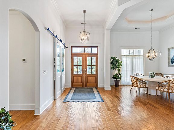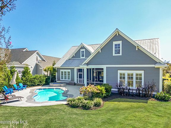 Welcome to 517 Moss Tree Drive - a charming and thoughtfully designed coastal retreat nestled on the 2nd hole of the prestigious Jack Nicklaus Signature Golf Course in Landfall. Built in 2017 with a touch of nautical whimsy, this home blends elegant single-level living with stylish updates and serene outdoor living spaces. Upon arrival your gaze will take you from the manicured yard to the expansive and inviting front porch. The home's exterior has been recently painted offering a crisp fresh look. Stepping through the double doors you will find the entire interior has been freshly painted from top to bottom, including all ceilings, walls and trim. The updated lighting fixtures elevate and refine each space. The home offers single-level living, with the exception of a spacious finished room over the garage—perfect for a guest suite or media room. There is a full bath so guests can have their own retreat.