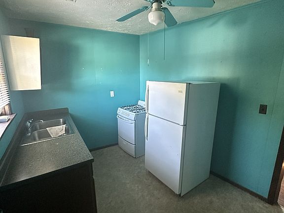 Fenced-in front yardKitchen with appliancesFront entrance stairs