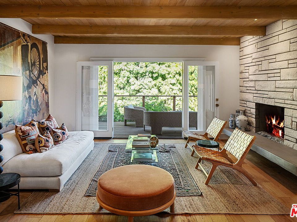 Perched on a tranquil, lightly traveled, road in a desirable pocket of Brentwood, this Hawaiian-inspired Mid-Century retreat is a unique offering of serenity, character, and effortless California living, with warm, inviting spaces designed for both relaxation and entertaining. Beyond the glass front doors, you're welcomed by a versatile entryway that opens to a formal sitting room on the left - anchored by a floating concrete fireplace, crowned with rich wood-paneled ceilings, and framed by double doors that lead to a wraparound deck with sweeping canyon and treetop views. To the right, an airy space offers flexibility as a study, lounge, or dining area. Straight ahead, steps lead to a cozy yet spacious living room featuring a built-in bar and seamless access to the backyard - ideal for indoor-outdoor living. The light-filled eat-in kitchen is thoughtfully outfitted with custom cabinetry, Caesarstone countertops, a carrara marble subway tile backsplash, and sleek stainless steel appliances. Completing the main level are three bedrooms - thoughtfully designed to avoid shared walls - two fully updated bathrooms, and a separate laundry room, offering both functionality and privacy. The primary suite occupies its own private level, basking in natural light from south, east, and west-facing windows. This peaceful hideaway features a reading nook, generous walk-in closet, and a spa-inspired bathroom with floating dual vanities, a walk-in shower, and a luxurious standalone soaking tub. This treetop haven is not only rich in charm and architectural character, but also perfectly located - just minutes from the Brentwood Country Mart, Brentwood Country Club, and within the coveted Kenter Canyon Elementary and Paul Revere Middle School districts. A true escape nestled in the heart of one of LA's most desirable neighborhoods.