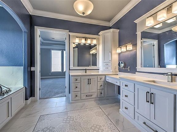 This amazing floor plan has 2 bedrooms, the main living room, office, and 2.5 bathrooms down. Upstairs features 2 bedrooms and a bonus room with wet bar, microwave, and mini-fridge! Both of these bedrooms have an attached bathroom. The kitchen is a chef's dream featuring high-end appliances, huge center island, and 10-ft ceilings. The entry is grand entry and welcomes you to this versatile floor plan. The master retreat is highlighted by a large whirlpool tub, walk-in shower, and an incredible master closet. Don't miss the 4-car with oversized bays! Port Cochere, 10-foot ceilings throughout the main floor, storm shelter, and more!!