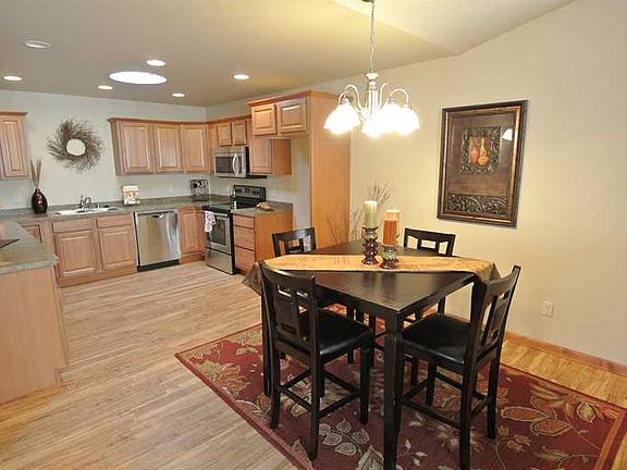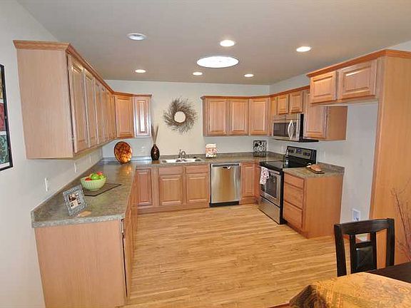 Beautiful new...spacious sunny living room with vaulted ceilings, glass patio door to deck/yard, big kitchen/lots of cabinets, skylight & dining area, master suite up, 2 more bedrooms down, family room & 2nd bath down, great plan, open & sunny!