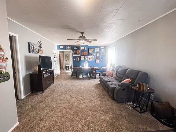 There is a total of 1,248 finished square feet on the main floor with additional square footage in the unfinished dirt basement. Through the front door, youll find a welcoming entryway that opens to a spacious living room and dining area. This space is finished with laminate flooring and has room for a coat rack, shoe rack, and/or bench. This is a great area to store coats, shoes, and outdoor items. Both the living and dining rooms feature built-in shelving for added functionality, throughout the home you will find built-ins along with abundant closet storage. The living room leads to the primary bedroom, which features a walk-in closet with a stylish barn door. Ceiling fans in both the primary bedroom and living room provide added comfort and help maintain a pleasant temperature.