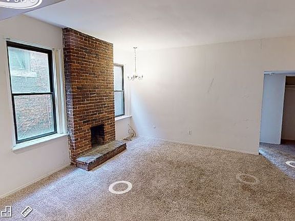 This 2-bedroom, 1-bathroom apartment in Oakland offers a comfortable and practical living space. The kitchen features warm wooden cabinetry, a full-sized refrigerator, gas stove, and a spacious breakfast bar that opens up to the main living area with carpet and a brick fireplace (not functional). Both bedrooms have great natural lighting.