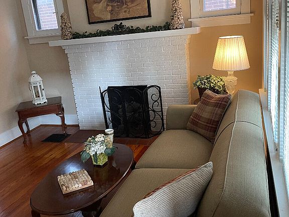 Gleaming hardwood floors throughout, arched doorways, and a lovely fireplace with mantel.