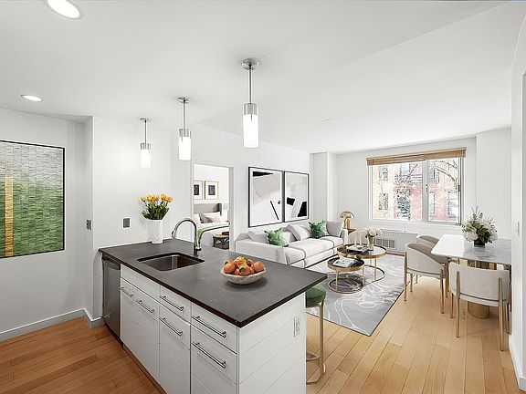 Welcome home to Residence 201 at The Clinton West, a full-service condominium building in the heart of Hell's Kitchen. Modern open concept kitchen with stainless steel appliances, stone countertops, and breakfast bar overlooking living and dining area full of South-facing natural light. Large primary suite includes luxurious spa-like bathroom and a fabulous custom-built walk-in closet. On the other side of the split layout apartment is a separate second bedroom with its own full bathroom and tub. Enjoy your in-unit washer/dryer, a large pantry and impressive closets throughout. Tremendous natural light, 9 foot high ceilings, and your very own spectacular 335 square foot roof oasis truly make this the perfect home.