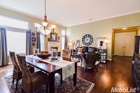 Fabulous! Loaded w/upgrades and custom features including walnut flooring throughout main living areas and kitchen. Crown molding, two fireplaces. Kitchen has tile counters/back splash, built-in double ovens, pantry closet, island & lots of cabinets. Master has walk-in closet and bath with dual sinks, separate tub/shower, & linen closet. Pebbletec pool with two waterfalls. Dual rear yard gates. Finished garage. Pre-plumbed for central vac. Dual pane windows & ceiling fans throughout.