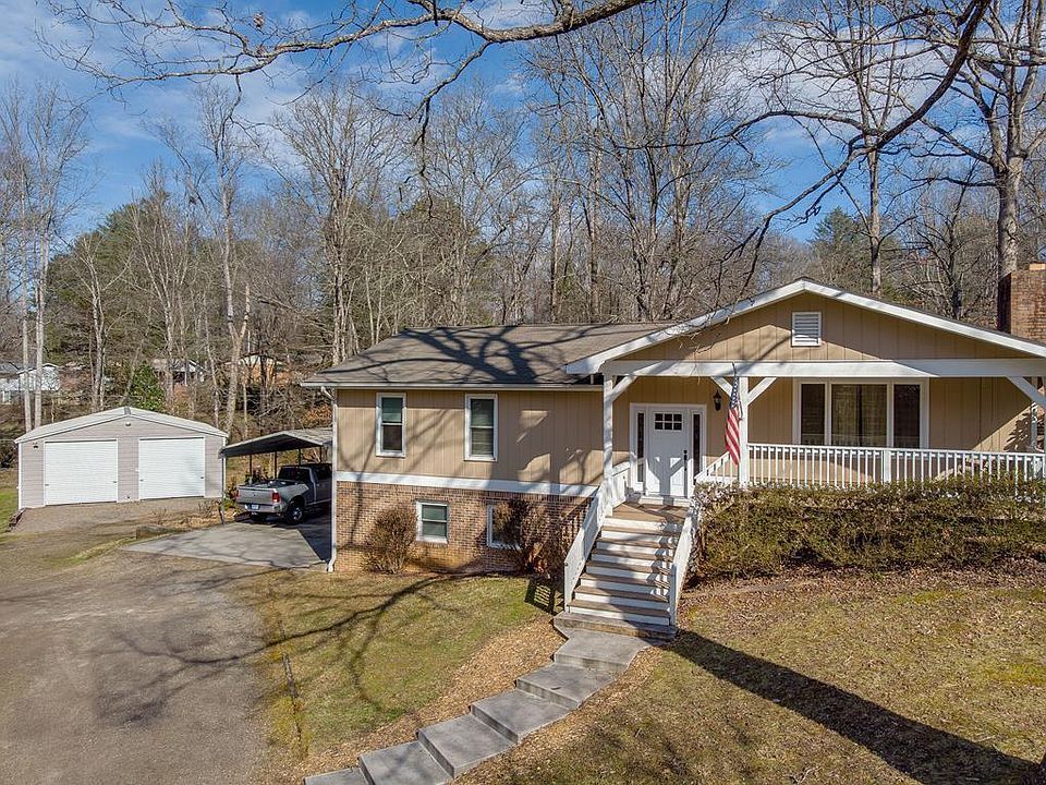 Great location, level yard, 40X30 garage, perfect size home!! 3/2 upstairs with a full in-law suite downstairs that could also be used as additional bedrooms/office & family room. Washer/Dryer & full kitchen are located on both levels. As you drive up you can enter directly into the basement by the carport or through the front door & peaceful deck. As you enter into the main level living room, enjoy the natural light from the large windows and relax by the gas fireplace, Three bedrooms are off to the left and formal dining room & kitchen to the right. Main level washer and dryer are located off the kitchen. Master has a private bathroom & two additional bedrooms share the guest bath across the hall. This home has great storage options with a pantry and a number of closets throughout the house. Downstairs the in-law suite consists of a large family room with a full kitchen, two additional bedrooms, one with a bathroom and washer/dryer. The 40X30 garage is wired for electric, has 2 roll-up bay doors and spray foam insulated ceiling. Fenced Dog Lot, 12X10 Shed. Nice level yard.