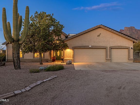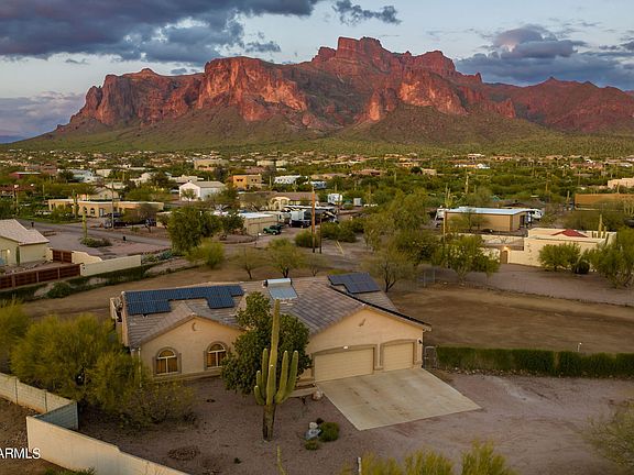 Great features abound! A first-class 1050 SF shop (includes HVAC + car lift!), SOLAR + an incredible view lot make this property really stand out. Giant 1.3-acre lot is completely usable: Flat, cleared and pristine. The house backs to Superstition Mountain for a view that never gets old. New high-end Trane HVAC's and hot water heater (2023) on the main house, and the roof was redone in 2021. All of the big ticket items are new/newer! The house is perfect, with 3 bedrooms (and a den with built-in cabinets/desk) and two large bathrooms. The backyard features an oversized patio, artificial turf and a relaxing firepit- with the majestic mountain looming. This home sits at the end of the street for maximum privacy/seclusion. Great properties like this are rare- book your appointment today!