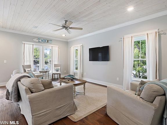 This is a custom built Fortified Gold 3 bed/2.5 bath home in highly desirable East Orange Beach! This home was built in 2017 by MKC Construction and has all of the touches of charm and character! Specs from the builder include the following: Under mount cabinet lighting, stainless steal appliances, granite counter tops throughout, custom soft closure cabinetry, Castlecome Wood floors throughout, tongue and groove ceilings throughout main living area, crown molding and custom window casings, walk-in laundry room, wood shelving, custom vanities in jack and jill guest bathroom, large storage area under the house, enclosed entryway and stairwell, metal roof, hardiwood, and large covered front and back decks with installed cable for TV on back deck. The home is raised and constructed to allow for plenty of space for entertaining and parking under the home. This home is located right behind Orange Beach Elementary and the new Orange Beach High School. Live the true local lifestyle with walking/golf cart distance to schools, the Orange Beach Rec Center, and plenty of restaurants. The neighborhood of East Orange Beach has a voluntary association for $195.00 per year and includes a boat launch and multiple private beach/water access points for homeowners only. This home is a must see!