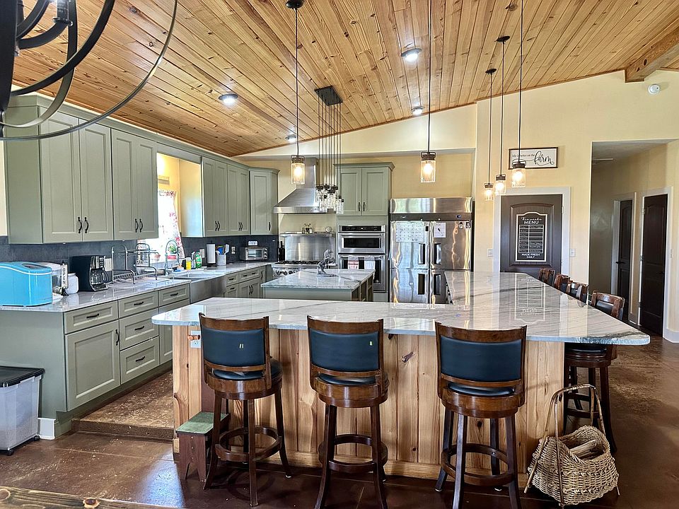- Breakfast Bar, Beamed Ceilings, Vaulted Ceiling(s), Kitchen Island, Pantry, Shelving, Bedroom, Dining Area, Kitchen, Living Room, Master Bathroom, Master Bedroom