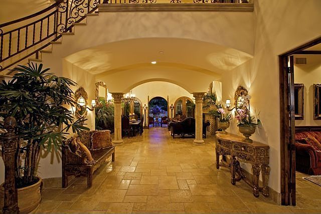 Reminiscent of a romantic Romanesque Castillo, this magnificent home exceeds every luxury with its custom designed elements and exceptional quality of construction. Patio doors lead to a dynamic natural stone waterfall and pool surrounded by mature specimen palms and lush landscape to create an intimate and private indoor/outdoor experience.