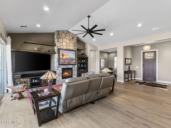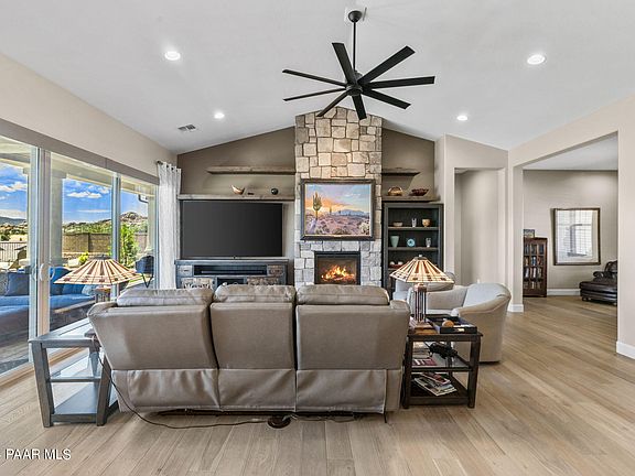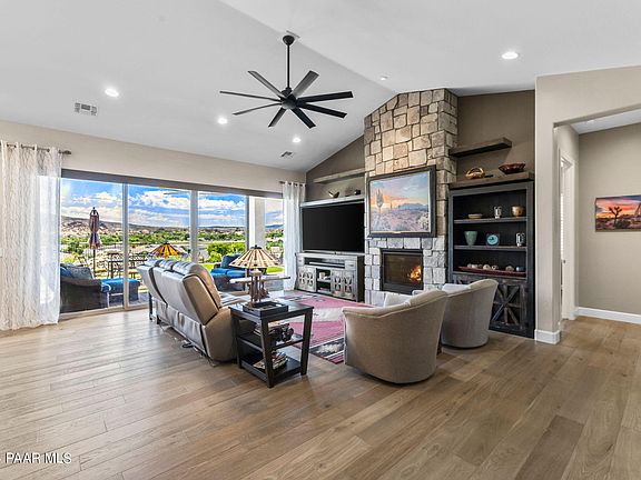 Immaculate move in ready home with amazing views of Granite Dells.this popular ''Sunflower'' single level floor plan features over $350K in builder, designer and owner upgrades,This gently lived in second home has all the best upgrades that you could imagine. Including a GE gourmet kitchen with gas cooktop, Quartz countertops, full granite backsplash, French Oak wood flooring ,upgraded custom cabinets in Kitchen, bathrooms and laundry. Spray foam insulation throughout home and garage,The garage offers an extra large heated and cooled 3 car garage with 4 foot extension, custom storage cabinets, workbench, bike rack, side door, utility sink, and a wall storage system.Seller has spared no expense in landscaping with fire pit, paver walkway artificial grass, Water feature and 5 Person Spa.