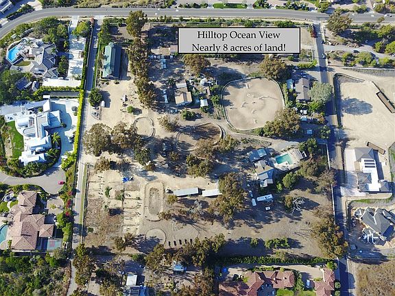 This unique and wonderful approximately 8 acre property is one of a kind!Located on a hilltop with views to the ocean and surrounding mountains! With lots of towering trees and ocean breezes flowing thru that will take you back in time! Yet only 5 minutes to the beach, direct access to the 56, and 20 minutes to downtown San Diego! And if you love horses, it's only 5 minutes to the Del Mar race track and tons of horse trails from the property! And yet so quiet and peaceful!! See supplement for more! This is one of the most sought after areas of San Diego! Excellent schools, universities, and close to everything! This would make a wonderful family compound! You can build your own special dream home here! For the last 55 years, it has been in the same family as a horse facility and run as a equestrian farm. There is a beautiful 12 stall barn with an additional 12 covered stalls outside with mats, wash areas, and grooming areas. The existing home is a Lindal cedar A frame home with lots of unique features and approximately 2140 sq ft. The home was built in 1980 and has a stand up basement with 900 sq ft of space! Outside and a few steps away is the pool and two car garage. Four entrances to the property and is fully fenced. There is sewer and water hook ups on front and rear of property. Meanwhile enjoy the private well wit excellent pressure and a 10,000 gallon holding tank! 3 spate septic systems. The pool house has it's own water and electric..turn this into a cool casita!! The possibilities are truly endless! Create your own dream! Currently zoned AR 1-1.