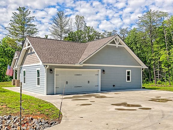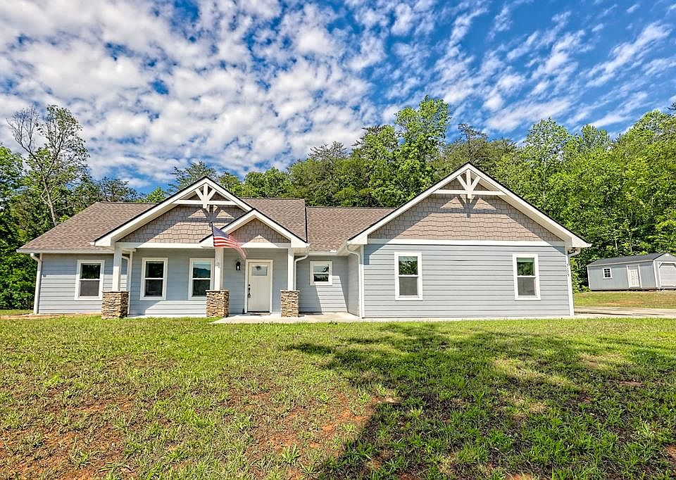 Welcome to your dream home! Like-new RANCH 3-bedroom, 2-bath boasts a thoughtfully designed split bedroom floor plan, offering both privacy and the comfort of one-level living. As you enter, you're greeted by a charming front porch that invites you to relax and take in the quiet surroundings. Step inside to find a modern kitchen featuring stunning quartz countertops, elegant gray shaker-style cabinetry and stainless-steel appliances. The open layout seamlessly connects to the cozy fireside family room, making it perfect for entertaining. The expansive primary suite is a true retreat, complete with an en-suite bathroom showcasing a seamless glass shower accented by designer tile, dual vanity, and spacious dual closets. Additional two secondary bedrooms share a full bath. Ample storage in the two-car garage and an outbuilding for your lawn equipment or future workshop. Nestled on a .75-acre level lot, you'll enjoy breathtaking mountain views from the front porch, while the private covered patio provides a quiet setting in your secluded backyard. With no HOA and no restrictions, you have the freedom to make this beautiful property your own. Owner upgrades include renovated bathrooms, new countertops in kitchen, all new lighting, appliances and window treatments throughout, expanded concrete drive, power ready and insulated storage shed, stone landscaping and paving community road.