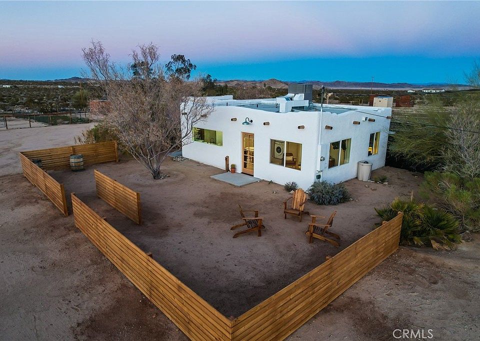 Located in one of the best pockets of Joshua Tree not too far from town, yet with a feeling of tranquil seclusion & privacy, this desert oasis awaits! Nestled on a huge and usable 5-acre lot, this 2-bedroom/2-bathroom Adobe casita is completely remodeled from top to bottom with extremely thoughtful handcrafted details throughout. Features include a brand new custom designed kitchen, stunning wood flooring throughout, a perfect layout to maximize space and dreamy desert landscape views for days in every direction. French doors lead to a large patio boasting a custom built deck and an oversized 6 person swim spa that can be switched from hot to cool depending on the season. The space serves as a perfect setting for both epic parties or quiet night time star gazing! The expansive lot also features a fenced in front yard with multiple lounge areas and a huge space that could be used for whatever you can dream up with both storage sheds and horse stables. Whether you’re seeking a profitable investment for a vacation rental or your own desert sanctuary, this one checks all the boxes!
