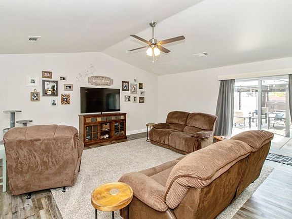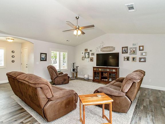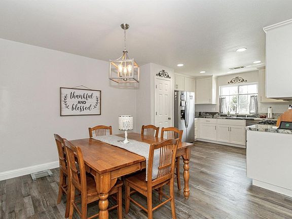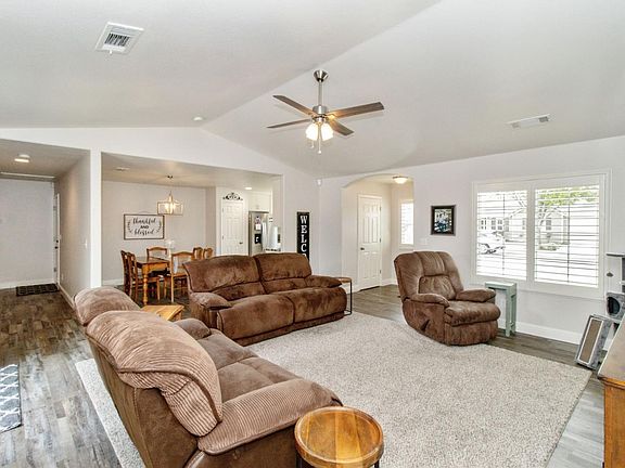 This is a beautiful 4-bed 2-bath home in SW Fresno. Entering the home, you find yourself in the spacious living room with a vaulted ceiling, attractive plank floor, exterior access through a sliding door, ceiling fan, and shutters. Off the living room is a practical eating area and an updated kitchen. After their purchase, the sellers completely updated the kitchen with new cabinets, granite countertops, stainless steel appliances, and overhead canned lighting. The bedrooms, bathrooms and the laundry room are down the hallway. The master bathroom and hall bathroom are upgraded with granite counter tops and white cabinets. The low maintenance back yard has plenty of space for entertaining, with a large concrete pad, a separate fire pit circle, and two covered gazebos. In addition to this, there is also a shed in the back corner for extra storage, a leased PPA solar system, and a finished garage. This home shows lots of pride in ownership.