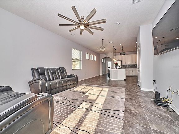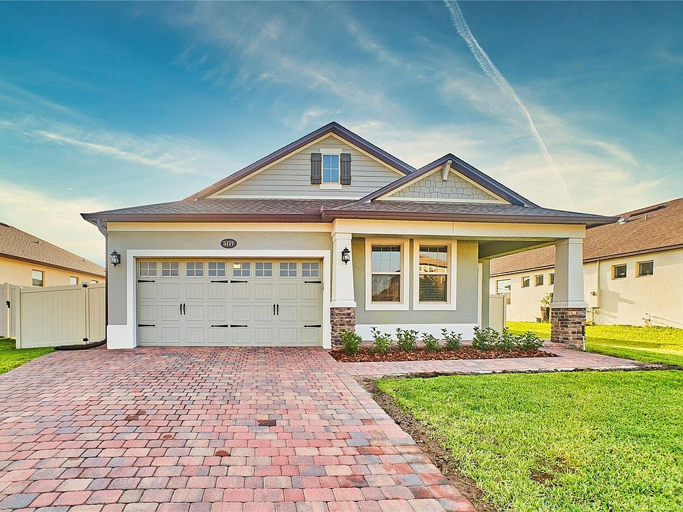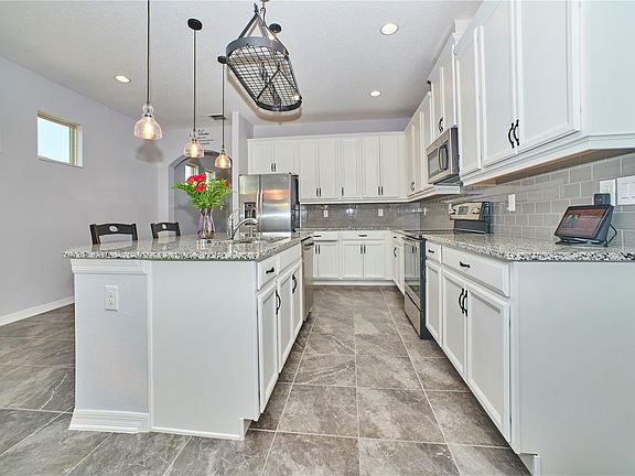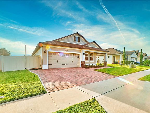 highly desirable Narcoossee Village community, this 4 bedroom 3 bathroom home is move in ready and boasts premium upgrades. Beautiful porcelain tiles from the entrance and throughout lead to a spacious laundry room, and into the kitchen and dining room. Features a large open floor plan with a gourmet kitchen. The gourmet kitchen features a built in double oven, large island, granite countertops, glass cooktop stove and a large deep farm style sink with a closet pantry for additional storage beyond the plentiful cabinet space. This home also features an extended lanai which can be accessed via large screened sliding doors providing a view to the yard. The large master bedroom features a tray ceiling with an attached master bathroom hosting a garden tub and large walk in shower with glass doors and very spacious walk in closet. Home includes lawn care and pest control