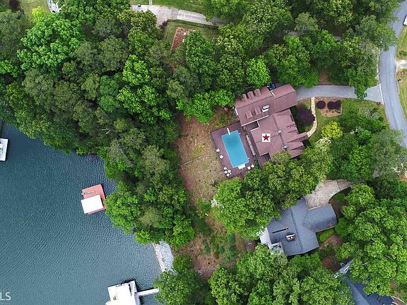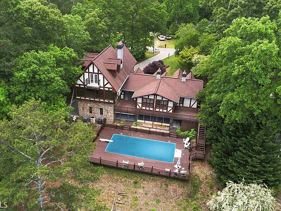 ESTATE OWNED. A truly one of a kind Bavarian-inspired home on Lake Lanier with deep water access. Single slip dock and breathtaking lake views. This 4534 sqft, 2 story entertainment home is graced with a large family room, sun room with year round lake views, additional living space downstairs with a full bar and fireplace that steps into a screen porch and to the large deck and inground pool. The tremendous master suite has spectacular lake views, 2 large walk-in closets, beautiful hardwoods with an impressive master bath. Priced below appraisal for renovations.
