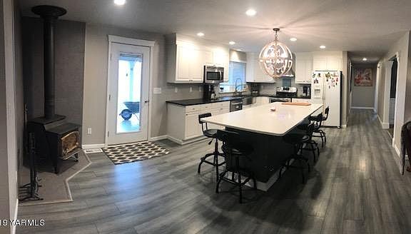 This home is situated in a private country neighborhood, close to town where all homes are sitting on 1 acre lots. Home is situated on front of lot with large fenced back yard, 2 out buildings (1 of which was previously used for cold storage and other 21' 9''x24 for boat) 2 covered awnings and dog kennel. Featuring recently updated large kitchen, large walk-in pantry, 2 master bedrooms with bathroom & walk-in closets, formal dining area, as well as new flooring. Kitchen features granite countertops as well as a 4'x9' quartz island seating 9 bar stools and wood burning stove. Covered back patio great for entertaining. RV parking with power. Great place to raise a family. The lot still has ample room for pool, shop and more. Lots of Potential left. Please take shoes off due to weather.