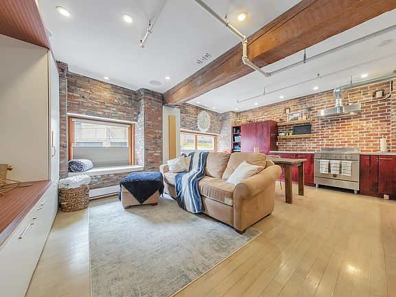 Studio 518 - Historic heritage warehouse originally build 1911 & converted in 1996. Excellent 758 SF loft floor plan w/bedroom that boasts 18" exposed fir beams. Thoroughly renovated with soft grey stained maple flooring compliments polished concrete & real brick wall combination. 9' ceiling entry way expands to serve as a contemporary built-in office & one brick step up into open concept living/kitchen, fully integrated with audio/media system. The spacious kitchen w/european appliances in SS, Bertazzoni stove, Thermador dishwasher featuring quartz counter tops & tilt & open luxury windows. Queen size bedroom with TV pillar & storage. Huge walk-in, seamless glass shower with Bosch laundry. Common Roof patio with views. Building plumbing in 2015, New Roof 2022. Rental & Pet Friendly.
