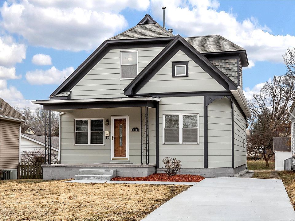 Quaint 1-1/2 Story, 3 Bedroom home close to downtown activities! Welcoming covered front porch opens to a freshly painted interior and new flooring throughout. Main floor features large living room, bonus room with sliding door and large window would make a great home office or could easily be converted into a 2nd main floor bedroom! Kitchen with separate dining room. Larger main floor bedroom with walk in closet. Upstairs you will find two bedrooms and bonus area that separates them. Zoned heating and cooling for comfortable living space upstairs! Exterior has been freshly painted and new concrete driveway has been poured. Nice size backyard. Basement is an unfinished walk out. Newer windows, furnace, and air. You will love the location, walk to downtown restaurants and festivals! Move in ready! Collinsville Occupancy passed. Some photos have been virtually staged to give a visual of furniture and decor.
