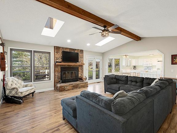 Charming ranch nestled on a 1.5 acre, scenic lot with a water view, saltwater pool, & backing to woods! 4 Beds, 3 Baths, and nearly 1,700 square feet of living space plus the finished, walkout Lower Level! Living Room with plank floors flow throughout most of the Main, WB fireplace, skylights & built-ins. Kitchen boasts a newer dishwasher, breakfast bar, Corian counters, pantry & bay window. Spacious Master Suite features a water view, walk-in closet, dual vanity, soaking tub & separate shower. Main Floor Laundry! Walkout LL boasts a huge Rec Room with built-ins that opens to hidden room, barn door to the 3rd Bath, huge 4th Bed with a walk-in closet & Bonus Room. Highlights: oversized 2 car garage, new roof (2023) & covered front porch. Relax on the composite deck or poolside & enjoy the huge patio & pool deck area with an aluminum fence. The park-like backyard also offers a firepit area, mature trees, zip line, tree house, great view of neighboring lake & woods with a creek!