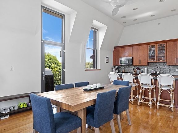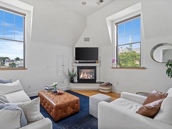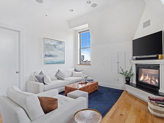 Welcome to one of the most unique and beautiful apartments South Boston has ever seen - with TWO deeded parking spaces! With a soaring 15'+ ceiling height and a plethora of skylights & windows, this unit stands alone. On the penthouse level of what was an old school, Unit #7 at 518 E 6th St. offers a beautiful and seamless flow of kitchen, dining & living space. The kitchen includes stainless steel appliances, gas cooking, an island big enough to seat 4 and a Wine Fridge. Enjoy the coziness of the gas fireplace located in the living room. This unit comes with 2 large bedrooms - primary with a walk-in closet & an en-suite bathroom & a large secondary bedroom with ample closet space. The second & shared full bath is located off of the dining room. Go up the spiral staircase to the office that leads to one of your TWO private outdoor spaces. Enjoy the unobstructed views & sun while cooking something on the grill. In-unit washer/dryer equipped.