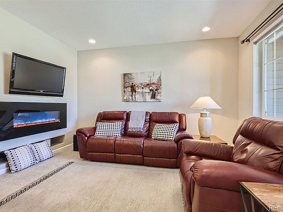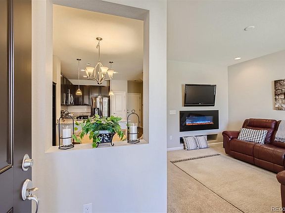 Family room is light and bright with a large window to the covered front porch - enjoy Colorado weather and meet your neighbors. The electric fireplace is unique - remote controlled with changing colors. Kitchen features stainless appliances and added built-in storage. New carpet in the past 9 months, whole house humidifer and air purifier. Storm door at front entry gives you the opportunity to flood your home with light & provides extra security.