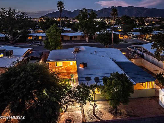 Mid-Century 1963 burnt adobe home with 4 bedrooms, 2 full bathrooms, and a versatile bonus room ideal for an office or studio. The updated open concept kitchen seamlessly flows into a spacious living and great room, highlighted by a cozy fireplace, high ceilings, and exposed wood beams. No HOA! This home features updated bathrooms, an enclosed porch, a laundry room, and a beautifully landscaped yard with mature citrus trees. Located just 8 minutes from La Encantada, 12 minutes from the University and Downtown. Walking distance to Tucson's best Farmers Market at The Rillito Regional Park! Outdoor enthusiasts will appreciate the close proximity to the Loop. Experience the perfect blend of classic charm and modern convenience. Schedule your visit today!