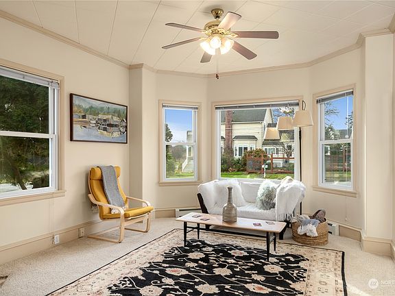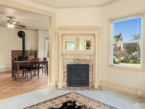 Location, location, location. Discover the charm of this historic 1878 Victorian home on a double lot in the highly sought-after UPTOWN of Port Townsend. The main floor features a classic parlor, elegant dining room, and a spacious bedroom, all showcasing original high ceilings and hardwood floors. Modern conveniences include a remodeled kitchen, 2+ bathrooms, and a large utility area. The second floor offers three additional bedrooms, two with peekaboo water views, and a cozy loft. Key updates include new Marvin fiberglass windows with a transferable warranty; a garage roof with a 5-year warranty replaced in 2022; high-efficiency washer/dryer; new Bosch dishwasher; LVP flooring in the kitchen; and an upgraded heating system. RIII zoning.