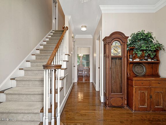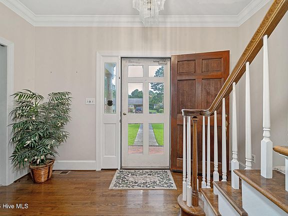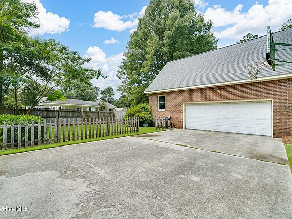 This stately brick veneer home sits on a corner lot in the town of Wallace, NC.   Step inside the inviting foyer and you will see yourself living here for years to come.  To your right, the formal living room is perfect for entertaining lots of family and neighbors this holiday season.  The living room flows to a formal DR which flows into the kitchen creating that wonderful traffic circle for easy flow of people while entertaining guests. Should you need a home office, the dining room is easily suitable for that purpose as an alternative use. The custom U shaped kitchen features stunning ceiling height cabinetry, rare parquet flooring, and a built in work station. A large den features built in bookshelves, wood paneling and parquet flooring as well. The main living level includes a half bath and a large laundry room. Upstairs three generous sized bedrooms share a hall bath. A fourth bedroom serves as the master suite  complete with ensuite bath and tons of closet space. A versatile bonus room being approx 14x32 is not presently heated or cooled, could be used as a fifth bedroom, playroom, or gym with the replacement of the wall mounted mini split unit. This would offer even more living space or great storage.