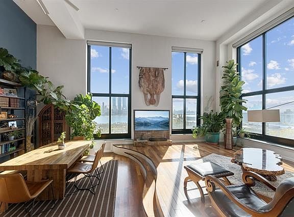 Unique loft style duplex features a 2 bedroom plus office/bedroom with 3 full baths, custom chef's kitchen with a pantry and SS appliances, 2 master bedroom suites with walk in closets, beautiful hardwood floors, Living room boasts 16ft ceilings and 13ft floor to ceiling windows offering spectacular views of the NY skyline creating an airy and elevated atmosphere. All day sun filled corner unit in a gated community. Full service amenity bldg with fitness center indoor pool, sauna, 24 hr doorman, and landscaped courtyard. Easy commute to NYC, just minutes to Weehawken and Hoboken ferry, shops and restaurants.