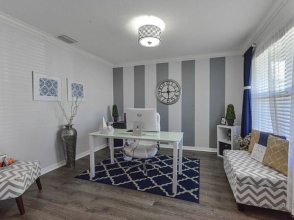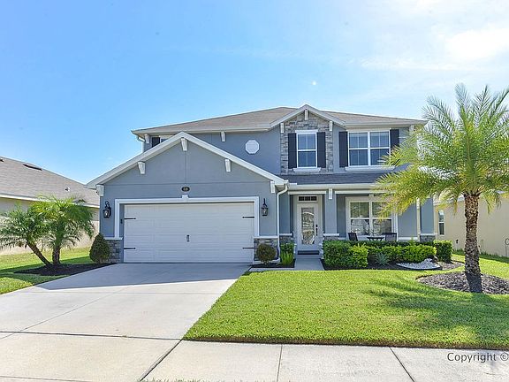 Active With Contract. A wonderful home for the growing family. Located in the Villages of Avalon, a quiet community with a pool, exercise room, and clubhouse. Very conveniently located near the Suncoast parkway for easy travel whether it be leisure or work. A beautiful calming blue color along with stone accents catches your eye from the curb. Mature landscaping along with lush green grass makes you proud to pull up to this home every day. An adorable front porch gives you a place to sit coffee and wave to neighbors. Inside you will find a lovely choice of paint colors, crown molding, and beautiful plank flooring flowing through the living areas. An open office area at the front of the home is available or you can use this as a formal dining room. The exquisite kitchen has dark wood cabinets, smooth granite counters, stainless steel appliances, recessed lighting, and a closet pantry. A dinette area is just off of the kitchen for east serving. The living room is a comfortable size and is light and bright. A half bath is downstairs for convenience. The master bedroom is on the first floor and holds comfortable carpeting and an elegant light fixture. The master bathroom has dual sinks, a walk-in closet and shower. Tile floors can be found in all the wet areas. Making your way upstairs you will find a large loft area. Use this space for whatever your needs may be. You also have 4 more bedrooms that are extremely spacious and are all comfortably carpeted. The guest bath and laundry room are also on the second floor. A great large backyard