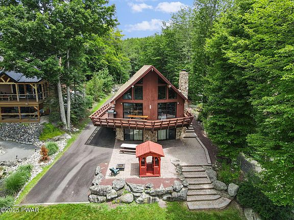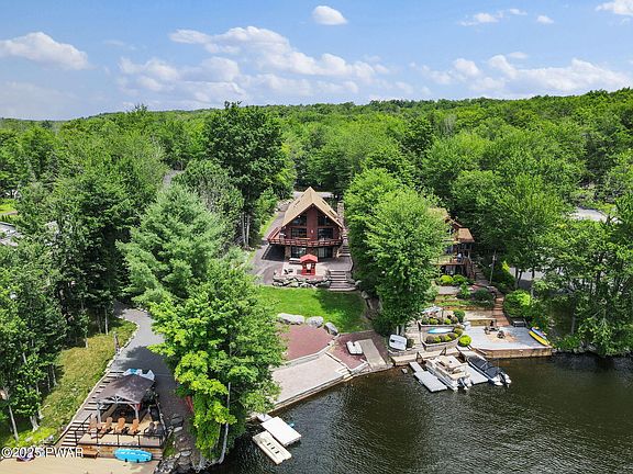 Roamingwood Lakefront Home with Stunning Straight-On Views - Best View Lot on This Powerboating Lake in The Hideout, an Amenity-Filled Community in The Northern PoconosThis beautifully built lakefront home offers one of the most sought-after views on Roamingwood Lake--a straight-on, full-length look right down the center of the water. Situated on a level lot with an easy approach to the lake, this property combines quality construction with comfort and functionality.Step inside to a massive great room featuring knotty pine ceilings and walls and a dramatic floor-to-ceiling stone wall surrounding a wood-burning fireplace--creating a warm and inviting mountain-lake feel. A paved driveway leads to a two-car garage, offering convenience and storage.The main level includes two bedrooms, including a spacious primary suite with a heart-shaped bathtub, and another full bathroom. Upstairs, you'll find a third bedroom and an adjoining room that can serve as a 4th bedroom or bonus space, along with another full bathroom.The finished walk-out lower level is ideal for entertaining or accommodating guests, complete with a large recreation room, a second fireplace, and a second kitchen--perfect for gatherings or a guest suite. There's also an additional room on this level that could easily serve as a 5th sleeping area, home office, or hobby room.Located in The Hideout, a gated, amenity-rich community with beaches, pools, golf, tennis, clubhouse, ski hill, and more, this property offers the best of year-round lakefront living on a powerboating lake in the heart of the Northern Poconos.