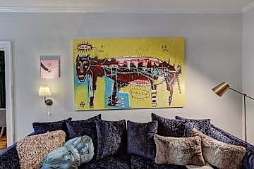 Relax in the spacious living room featuring a large, upholstered sofa and a flatscreen television with streaming and Live TV. Enjoy the artwork by local artist Nico Amortegui, well-known for large-scale paintings and installations throughout NC and the Smithsonian.
