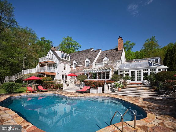 A long gated, tree lined driveway leads one into this cloistered family compound with a custom reproduction manor house, a  4 bedroom carriage house with a gated private motor court, and breathtaking gardens. Espalier fruit trees guide one through hidden stone paths to a potting house and a fenced orchard. A conservatory opens out to expansive terraces, leading to the heated in ground pool, hot tub, and stone deck, bordered with lush perennials and manicured privet. Beyond the pool is a pond with a fountain surrounded by verdant landscape and a foot bridge to the hen house. This magnificent property is set on 5 secluded acres in the heart of Upper Makefield Township. The main house features an elegantly appointed foyer with sweeping circular staircase. To the right, a formal living room with fireplace and sitting room, to the left, a formal dining room. An expansive library with fireplace provides access to the terrace. Beyond you’ll discover the commercially appointed gourmet kitchen, a breakfast room with walk-in fireplace overlooking the pool, a glass conservatory opening to expansive terraces on one side and secret gardens on the other.  The main house features 6 bedrooms, 5 are en-suites with fireplaces, one has a hall bathroom. There is also a powder room and laundry room on the main level. On the lower level one will discover an additional bedroom, full bath, a full bar, game room with pool table, workout room and storage rooms. The carriage house has 4 en suite guest rooms with outdoor living spaces, and a large conference room with hall bath. This property has 5 oversized garages, lush grounds, full irrigation system supplying the hanging planters flanking the driveway and motor court, and security system. This is a rare opportunity to become the next steward of such a significant and iconic property.