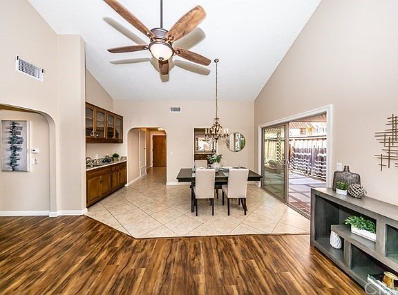 SINGLE STORY and with all the touches! The Open floor plan and well lit home greets you. Living room with cozy fireplace, fan, laminate flooring and wraparound windows allow for plenty of natural lighting to enter. Formal Dining room with wet bar and custom cabinets for storage. Kitchen has a bay window with an area for additional eating. Master Bedroom has a walk in closest and vaulted ceilings. Upgraded Master bathroom features dual vanities, large soaking tub and extra cabinets for storage. Secondary bedroom features mirrored closets and an additonal upgraded bathroom. Tile and laminate flooring throughout, blinds, laminate and tiled flooring, freshly painted, new light fixtures, appliances and much more! Walking distance to Alta Vista Country Club and Golf Course, Champions Sports Complex, Schools and Shopping. Rent includes access to the pool, spa, tennis courts, clubhouse, gated community and cable TV. Your next home is ready for you!