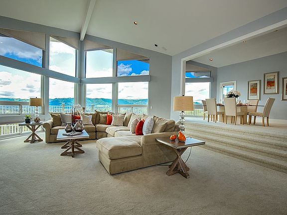 Captivating panoramic, unobstructed views from oak-studded property at top-of-the-hill Round Hill Estates North, above Alamo's Round Hill CC. Formal living room with fireplace and wet bar, dining room offers deck access. Updated (2020) gourmet kitchen with granite counters, custom island/breakfast bar, custom cabinetry with pullout shelves, and electric and gas cooktops. Family/game room with yard access. Master suite on private level includes fireplace, slider to private deck, updated bathroom with jetted tub, oversized shower, walk-in closet. Main-level guestroom. Lower level includes 3 bedrooms, 1 bath, and pool access. 400+/- bottle wine cellar. Walls of windows, hardwood flooring, plush carpeting, tinted dual pane windows, vaulted ceilings. 3-zoned HVAC. Lap pool, 8-person hot tub. Southern-facing decks across entire back of home. Championship 18-hole golf course, tennis, pool, fitness, clubhouse. Easy freeway access to Silicon Valley, SF, BART. Nearby top-rated SRVUSD schools.
