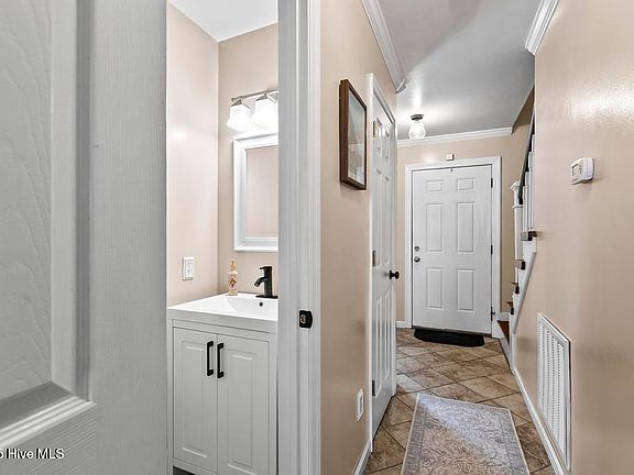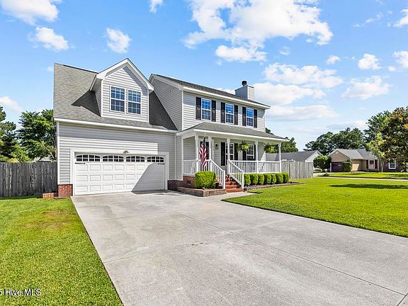 Welcome to 518 Raintree Road, a spacious two-story home situated on a desirable corner lot in the established Raintree subdivision. Just minutes from area schools, shopping, Camp Lejeune, and Camp Johnson, this home offers a convenient lifestyle in a community that reflects pride of ownership. The exterior features a covered front porch, a fully fenced backyard, and a patio deck perfect for entertaining. Enjoy relaxing evenings around the stacked stone fire pit, complete with pea gravel surround and string lighting that adds a cozy ambiance. Lush lawn and landscaping add to the curb appeal, and the two-car garage offers additional storage. Step inside to a welcoming layout that begins with a foyer leading to the half bath, kitchen, and living areas. The living room features a cozy fireplace, with natural light streaming in from front-facing windows. Adjacent to the living room is a formal dining room highlighted by elegant judges paneling and crown molding. The main floor showcases wide LVP and tile flooring, stylish light fixtures, and crown molding throughout. The kitchen is both functional and inviting, featuring crisp white cabinetry, stainless steel appliances, and ample counter and cabinet space for meal prep and storage. Upstairs, the expansive primary suite offers plenty of room for oversized furniture, a large walk-in closet, and an ensuite bath with dual vanity. Two additional guest bedrooms, one with a walk-in closet, along with a guest bathroom and laundry closet, complete the second level.