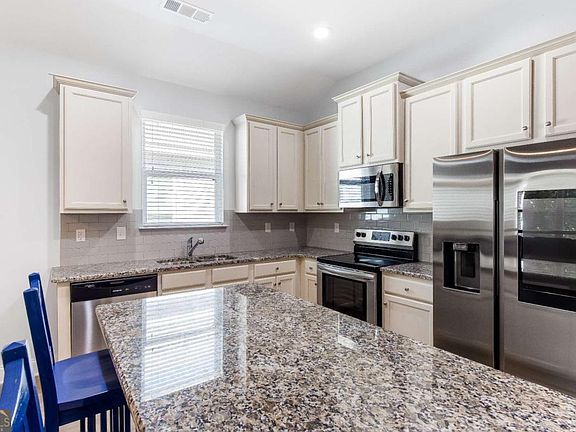 Welcome to this charming one-level, two-bedroom, two-bath townhome perfectly situated in a desirable gated community close to schools, parks, recreational facilities, golf courses, and all your favorite shopping and dining, including Sam's Club. With easy access to major highways, your daily commute and weekend outings are a breeze. The inviting exterior features a covered front porch with stone accents and an attached one-car garage with driveway parking. Step inside the foyer to discover an open-concept main living area designed for comfort and style. Spacious family room flows effortlessly into the kitchen, which boasts granite countertops, an island with breakfast bar seating, tile backsplash, stainless steel appliances, and a cozy breakfast nook with wainscoting, perfect for casual dining. This thoughtfully designed split-bedroom floor plan offers privacy for everyone. The primary suite, located at the back of the home, features a walk-in shower, double vanity with a convenient makeup counter, and generous closet space. A second bedroom and full bath are positioned at the front of the home, ideal for guests, home office, or a roommate. Enjoy your covered patio complete with a TV mount ready for outdoor entertainment. Add your favorite furniture, perhaps a propane fire pit, and unwind while watching your favorite show or movie night under the stars. This home combines low-maintenance living with modern finishes and a prime location!