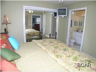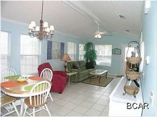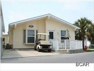 Gorgeous partially furnished home in Venture Out! Great convenient location- quick access to the bay or beach! Perfect for a family's full time residence, second home, or investment property to rent out. Plenty of room & storage with upgrades galore including Corian countertops in kitchen, ceramic tile, crown mouldings, cultured marble countertops on vanities, walk in shower, ceiling fans even a convenient outdoor shower. Laundry room is complete with washer & dryer and plenty of storage room too. Amenities galore at Venture Out include- deeded access to 300ft. of the beautiful gulf beach, the serene St. Andrews Bay, two pools (one heated) plus a kiddie pool, boat launch & boat docks, a fishing pier, a great playground, basketball court, shuffleboard, tennis, putting green, picnic areas w/ grills, and a clubhouse with fun, planned activities. This is a golf cart community with 24/7 live guards stationed at the entrance, and roaming through the park for optimum security! Kids, adults, and seniors all enjoy living and playing at Venture Out!