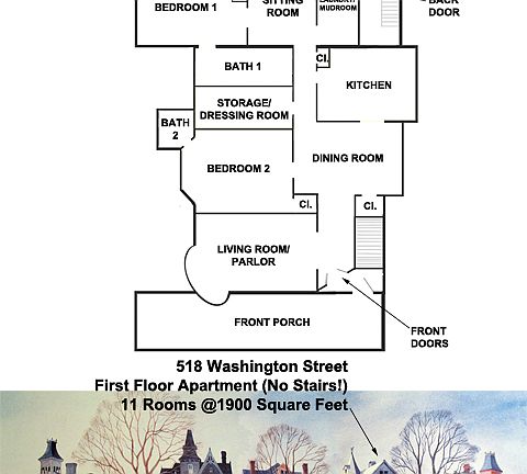 11-Room, newly-renovated apartment for rent in a historic Queen Anne Victorian home on a level section of Washington Street in Cumberland, Maryland. This huge, first-floor apartment has 1900 square feet of living all on ONE FLOOR with NO STAIRS! Eliminate stairs with no need to downsize!! The apartment includes 2 bedrooms - each with ensuite bathrooms - as well as an entry hall, living room/parlor, dining room, kitchen, dressing room, office, laundry room, and 400 square foot sunroom/family room. There is also a covered 400 square foot front porch overlooking the Washington Street Historic District. Most rooms are wired for cable and phone. Appliances included. Shaded, level street parking right in front along the brick sidewalks. Strictly non-smoking.
