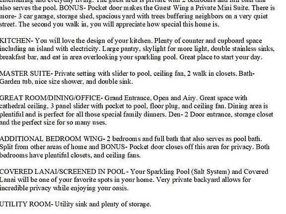 Pine Ridge- 3 Bedroom, W/Den, 2 Bath, 3 Car Garage Pool Home. Home has an incredibly functional kitchen w/plenty of counter & cupboard space, large pantry, & eat in area. Your master suite is the perfect size including a well-designed bathroom w/dual sinks, garden tub, & plentiful shower. The great room that opens to your covered lanai is spacious including a formal dining area and den/office. Great for entertaining and everyday living. The guest area is private with 2 bedrooms and full bath that also serves the pool. BONUS- Pocket door makes the Guest Wing a Private Mini Suite. There is more- 3 car garage, storage shed, spacious yard with trees buffering neighbors on a very quiet street. The second you walk in, you will appreciate how special this home is.