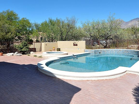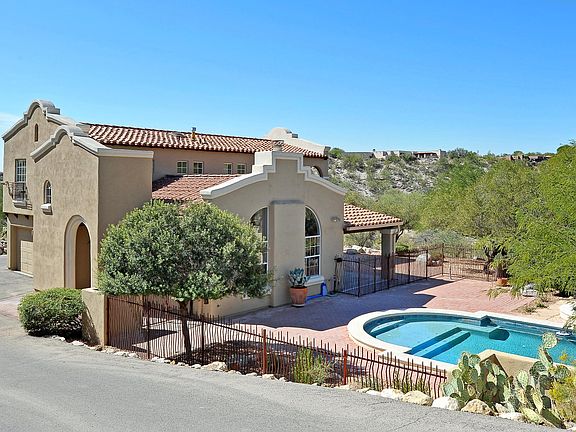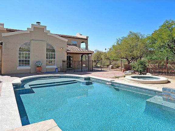 Beautiful Spanish Mission style custom Catalina Foothills home nestled in among rolling hills & natural desert. Soaring ceilings & high arched windows in the living room frame a cozy wood burning fireplace & mountain views. Separate family room is open to the kitchen featuring granite countertops, island with breakfast bar, gas stove & French door refrigerator. Spacious master bedroom suite with walk-in closet & it's own covered balcony - perfect for enjoying our famous sunsets. Master bath has a double vanity sink & walk-in shower. All 3 guest bedrooms are spacious & bright. Take advantage of spectacular outdoor living with two covered patios, spacious backyard & sparkling pool with spa. One year minimum lease. $45 application fee per adult. Security system & freezer in garage are as-is.