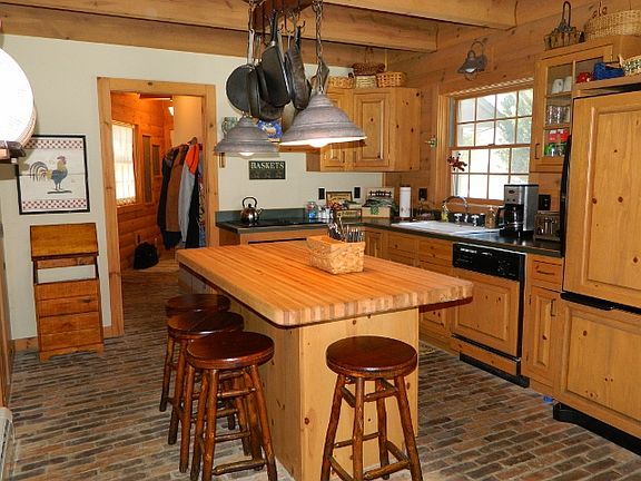 Cape Cod, stained 1/4 log home nestled on 2.39 acres of wooded serene paradise. This 3 bedroom, 3 ½ bath. Home has Custom Kitchen with Island, split brick floor in ½ bath, laundry room, kitchen and foyer. Dining area overlooking covered porch, lake and screened in porch. Living area has full brick wood burning fireplace, surround sound and entrance to covered porch. 1st floor Master Bedroom with full bath. Custom stair well entering second floor cat walk and loft area. Two bedrooms , both having dormers for views of the lake and additional light. Two full baths. 14’ X 23’ bonus room currently being used as bunk room. Custom wood work supplied by: The Woodworkers Shop.