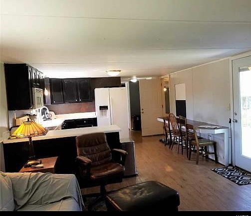 Country living at its best. Move-in ready with 3 bedrooms and 2 baths. 14 x 70 manufactured home with an added 12 x 30 Primary ensuite. Addition has a private entrance so could be used for an office or business with handicapped accessibility. Master has walk-in closet and bathroom has a tiled, walk-in double shower and full sized w/d. One bd has a full wall of built-in cubicles and a desk, great for sewing. Open floor plan incl.a large breakfast bar with storage below. Enjoy nature from the covered front porch or back patio. 2 acres are level, fenced (incl. electric), surrounded by trees with 2 lean-tos and a little chicken house. North side has a pond (needs work) and 3 sheds. Property is 100% electric and all appliances stay, incl w/d. There is private septic and a deep well. Newer 50 gal water heater, R-30 insulation and underlayment below. Central heat and AC. Property taxes are $242 yearly. Selling "as is".