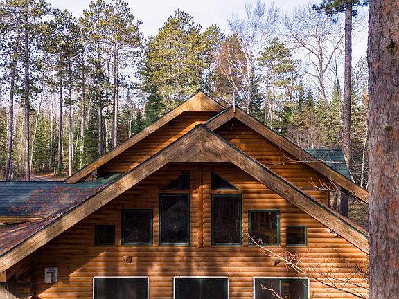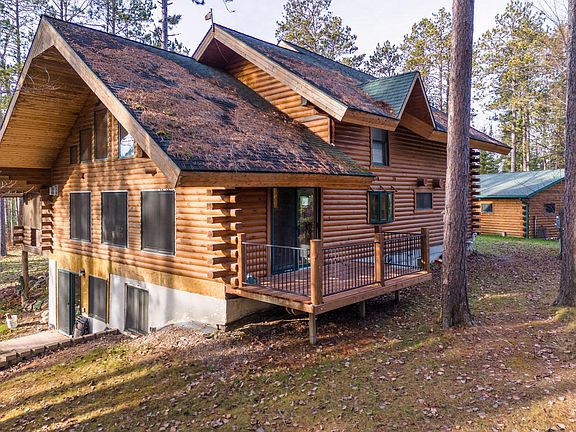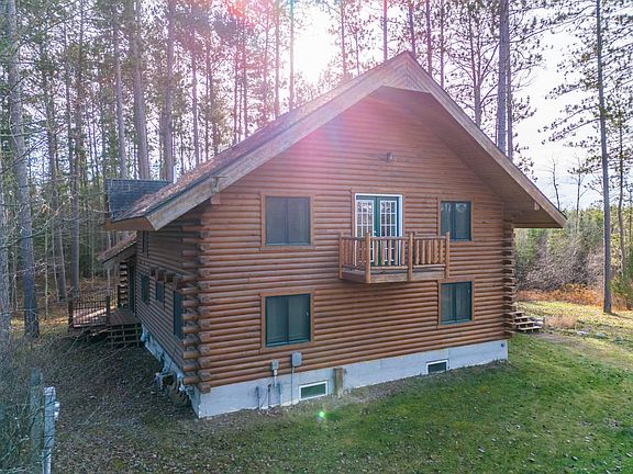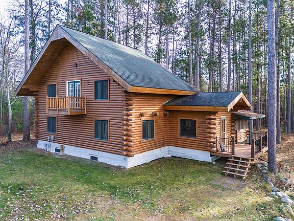 This stunning 3 story custom built log home is nestled on 4.6 pristine acres, bordering public land. Surrounded by mature Norway Pine, Maple, Birch, Balsam and Spruce, this home offers a serene and private atmosphere. The expansive great room connecting with the open kitchen and dining room features soaring ceilings, fireplace and numerous windows that provide breathtaking views. The spacious bedrooms on all levels offer unique charm. Propane and off-peak electric in-floor heat on the main and lower levels and garage, makes certain that you stay warm and cozy in the winter. In the loft, you'll find a home office and reading area, a bedroom suite that boasts a private balcony, walk-in closet and large bathroom with a jacuzzi tub and shower. Finished walkout basement offers a family room, bedroom, exercise area, 3/4 bath, a full bar and a backyard patio area, where you can enjoy the scenery and watch wildlife roam freely. Located near many lakes, snowmobile/ATV trails, bait, gas & food.