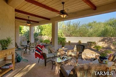 Gorgeous w/all possible upgrades & the best covered patio in Sabino Springs! For AZ living & entertaining, see this inviting outdoor room w/fans, lighting & charm. 3br & den in a gated golf course area has upgraded m/bath, extended garage w/A/C, Viking appliances, maple cabinets, corian countertops, entertainment wall & FP, 18 inch tile, built-ins in office. All perfectly planned & maintained! Convenient to community pool, spa & fitness.
